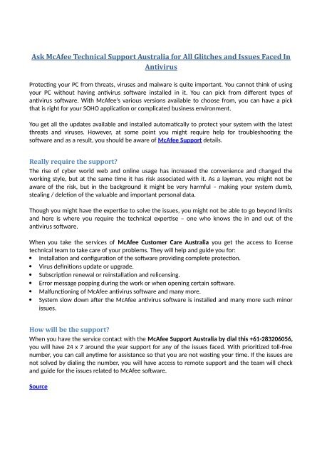 McAfee Antivirus Technical support number to get the best Once you dial our McAfee Antivirus Technical Support Phone Number +(1) -888-846-5560, you will directly be connected with our technicians who will listen to your query and then give you the best ...