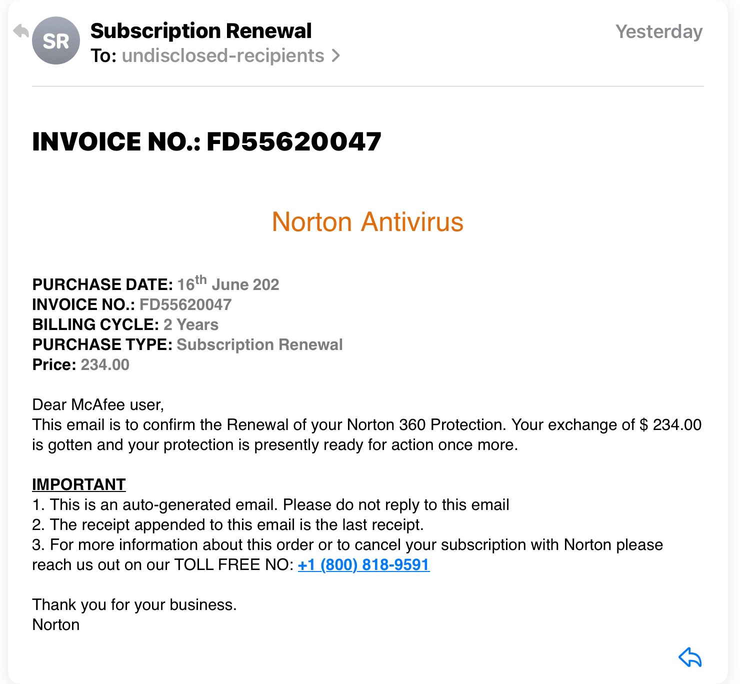 Scammed by Fake Norton Antivirus, Lifelock? Here's What to ... First, the sender's email address is completely bogus. The only way to realize where the email is coming from is to place the mouse over top of the 'From' field to reveal the true sending address, or to view the email message headers in their entirety. Second - the phone number is fake. They ask you to call 1-833-NORTON8 ( as seen in the pic ...