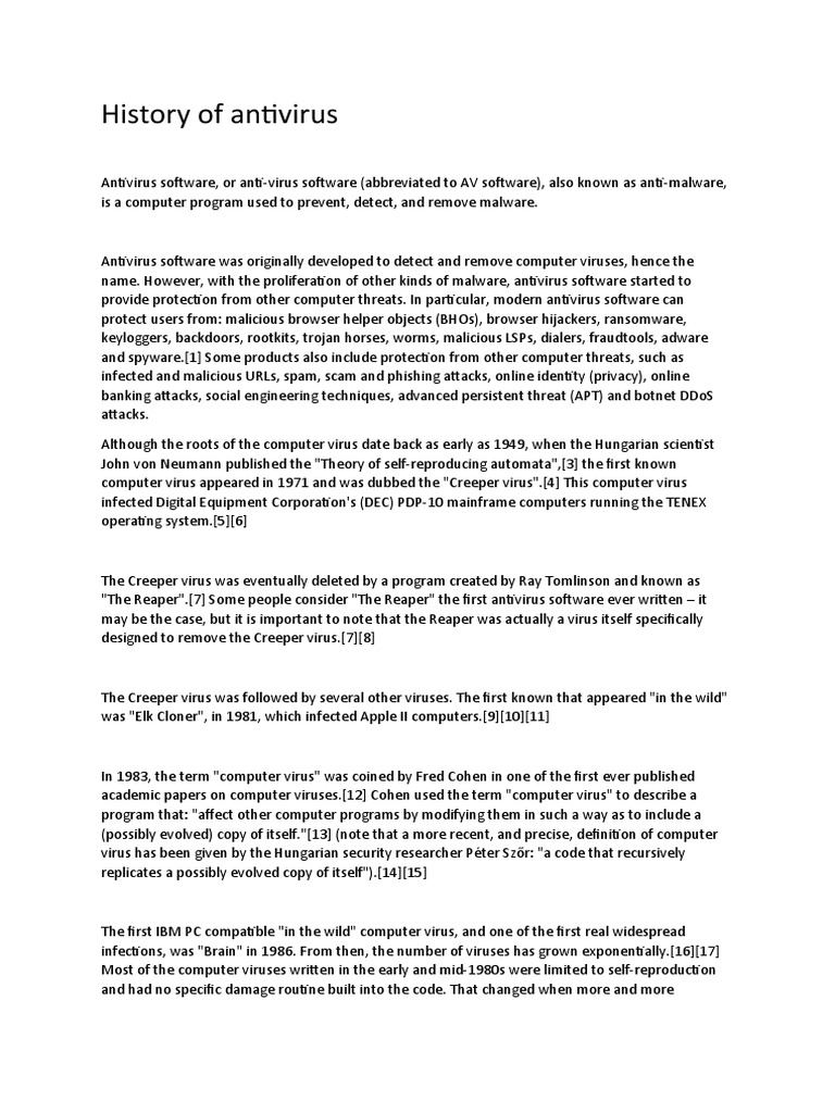 History of Cyber Security - GeeksforGeeks Web22.06.2022 · Ray Tomlinson, the innovator of email, wrote the program Reaper, which chased and deleted Creepers. Reaper was the very first example of checking a malware antivirus software and the first self-replicating program i.e. Viruses, as it made first-ever computer worms and trojans. In 1971s, Programmer Bob Thomas made history by … Computer virus - Wikipedia WebThe Reaper program was created to delete Creeper. In ... There are two common methods that an antivirus software application uses to detect viruses, as described in the antivirus software article. The first, and by far the most common method of virus detection is using a list of virus signature definitions. This works by examining the content of the computer's … Antivirus software - Wikipedia WebThe Creeper virus was eventually deleted by a program created by Ray Tomlinson and known as "The Reaper". Some people consider "The Reaper" the first antivirus software ever written – it may be the case, but it is important to note that the Reaper was actually a virus itself specifically designed to remove the Creeper virus. The Creeper virus was … Creeper and Reaper - Wikipedia WebCreeper was an experimental computer program written by Bob Thomas at BBN in 1971. Its original iteration was designed to move between DEC PDP-10 mainframe computers running the TENEX operating system using the ARPANET, with a later version by Ray Tomlinson designed to copy itself between computers rather than simply move. This self-replicating …